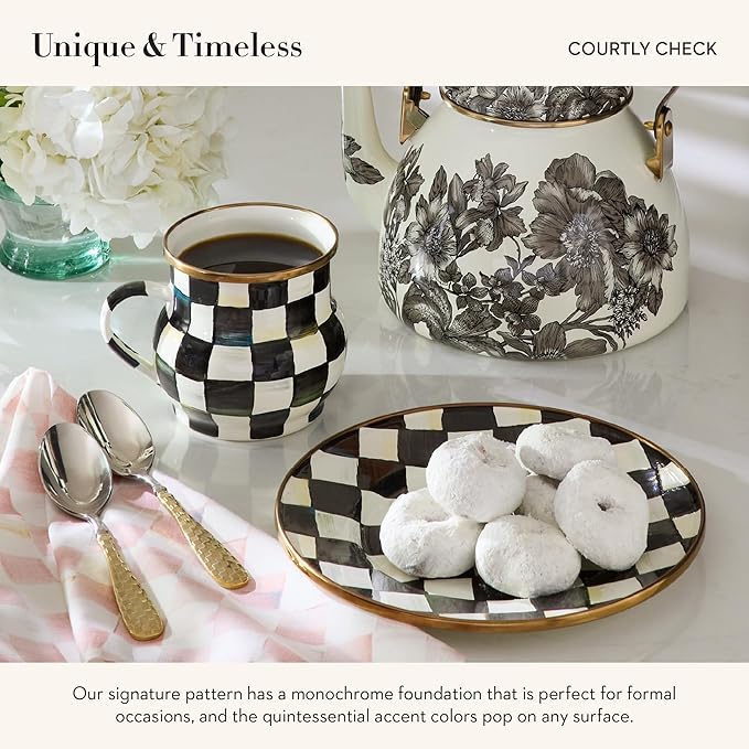- ELEGANT SERVING ESSENTIAL: Our iconic Courtly Check Enamel Salad and Dessert Plate is great for lunch or a chic snack. This decorative plate features a glazed heavy-gauge steel underbody decorated with black-and-white color-dragged checks.
