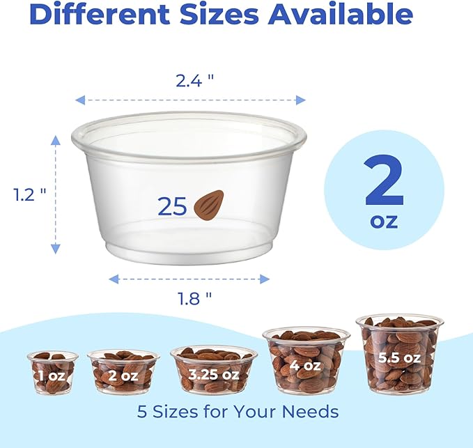 - STACKABLE & EASILY STORED- These 2oz containers with lids for food can be stacked without collapse. It will provide a dust-free environment for your jello shots, salad dressing, condiment, sauce, and more. So you can dip in your favorite food with a peaceful mind.