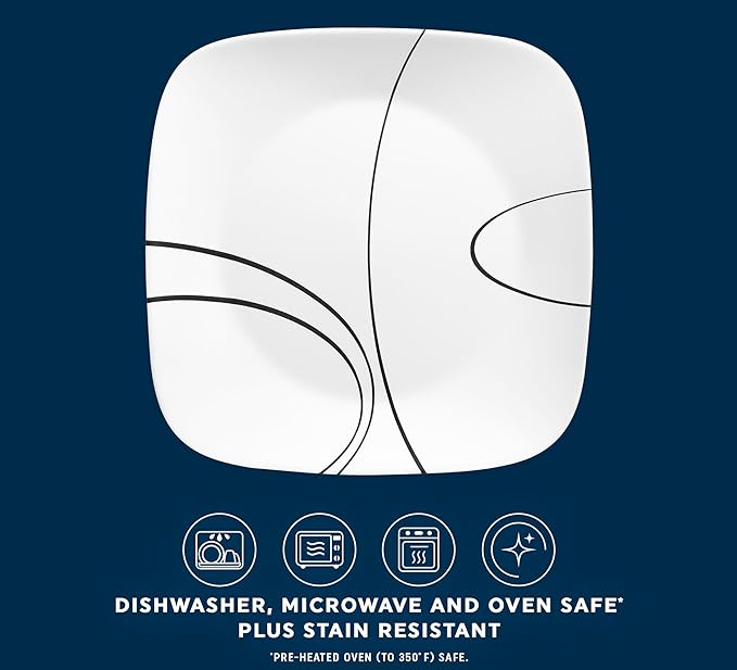 Corelle 18-Piece Service for 6 Dinnerware Set Triple Layer Glass and Chip Resistant, Lightweight Square Plates and Bowls Set, Simple Lines