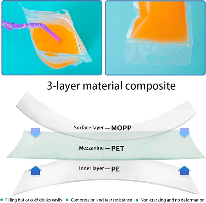 - Easy to Use: Drink pouches for adults are made of food grade PP raw materials, use the funnel to pour beverage slowly in the drink pouches, the reclosable zip; filled juice pouches with stand-up gusset bottom allows you to place the drink on a table