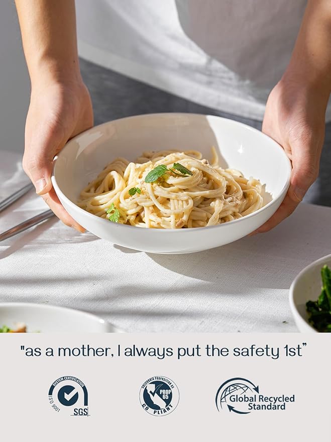 - Eating At Home, Eating Healthy: These soft white pasta bowls are made of top grade eco-friendly ceramic. They are proudly quality approved porcelain. Lead-free and cadmium-free for your healthy life. The superior durability and edge strength will ensure years of use.