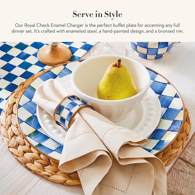 - ELEGANT SERVING ESSENTIAL: The Royal Check Charger Plate is a regal take on enamel dinnerware. This decorative plate features a heavy-gauge steel underbody decorated with blue-and-white checks and is rimmed in bronzed stainless steel.