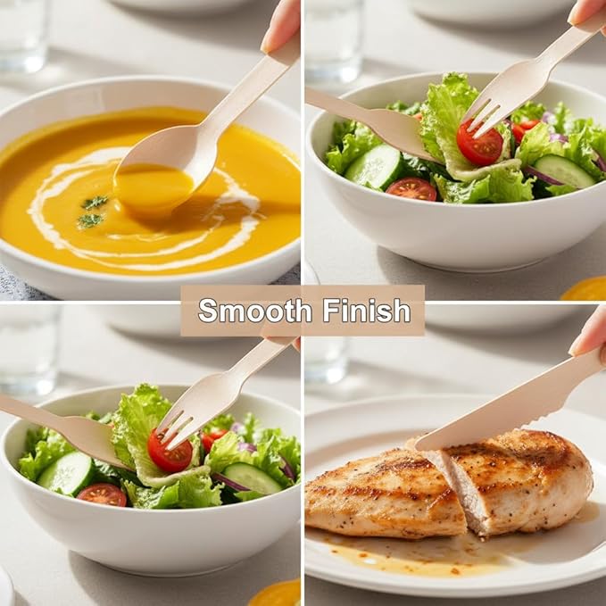 - HIGH QUALITY: EZYLINKER wooden disposable cutlery is meant to provide you with the greatest experience possible. Each piece is meticulously crafted and checked! We meticulously polish each piece of cutlery to guarantee that the surface is smooth and splinter-free, and most importantly, that it is solid, resilient, and will not break!