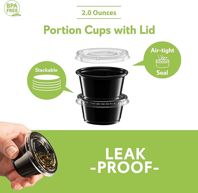 - {2 oz - 100 Sets} Black Diposable Plastic Portion Cups With Lids, Small Mini Containers For Portion Controll, Jello Shots, Meal Prep, Sauce Cups, Slime, Condiments, Medicine, Dressings, Crafts, Disposable Souffle Cups & Much more