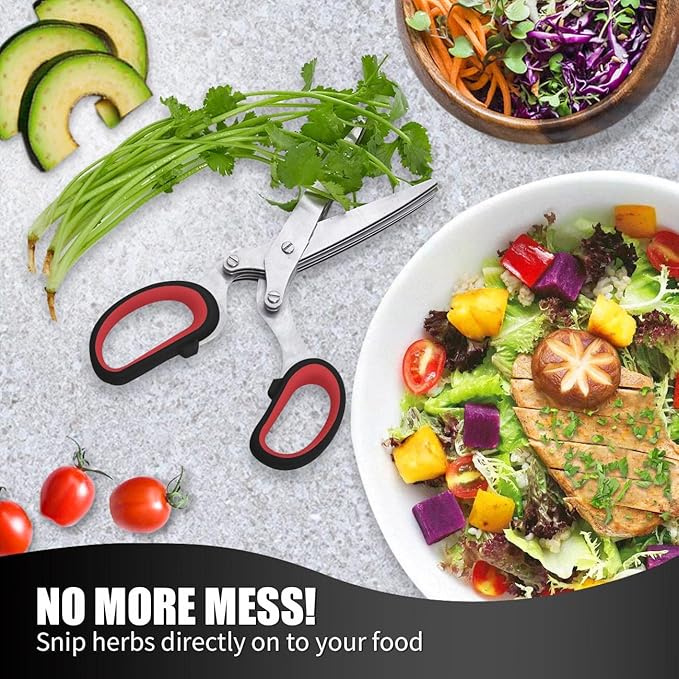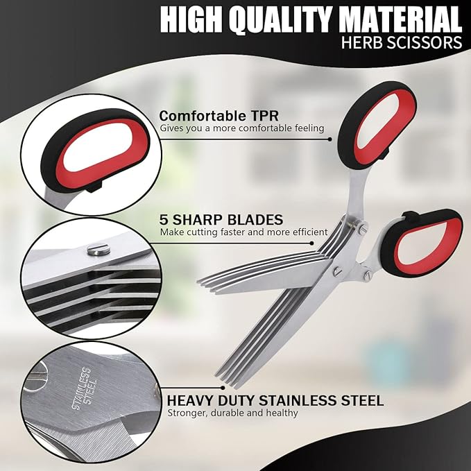 - Save Time and Hassle - Herb Cutting Scissors allow you to cut and mince fresh herbs, basil or chives directly into any dish without the tedious work. With the sharp, finely balanced 5 blades equals 10 knife chops can greatly improve your cooking efficiency. No more cleaning knives and cutting boards.