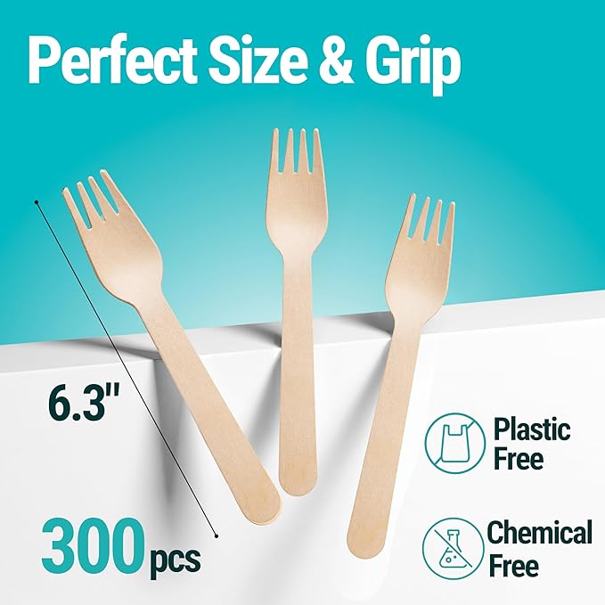 Disposable Wooden Forks For Eating - 300pcs - Heavy Duty & Sharp - Our Guilt-Free FSC Certified Wood Protects Forests - A Great Alternative to Bamboo Forks Disposable