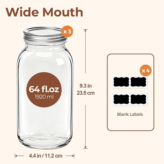 - Package Content: 64 oz canning jar x 3; black label x 4. These water-proof labels simplify organization and identification of your jar's contents. It helps you keep everything neatly sorted.