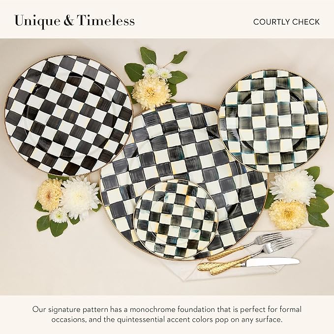 - ELEGANT SERVING ESSENTIAL: The Courtly Check Charger Plate is a classic take on enamel dinnerware. This decorative plate features a heavy-gauge steel underbody decorated with black-and-white checks and is rimmed in bronzed stainless steel.