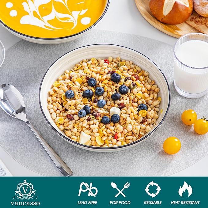 - 【Multifunctional Pasta Bowls】 These shallow bowls set are suitable for soups, cereal, burrito bowls, stir fries, seafood, stews, casseroles, and more. vancasso pasta bowls are suitable for all delicious food!