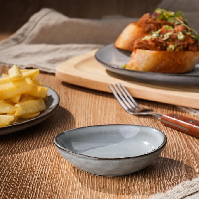 famiware Ocean Soy Sauce Dishes of 6, Oval Dipping Sauce Cups/Bowls/Dishes for Kitchen, 2.1oz Ceramic Small Bowls for Side Dish, Appetizers, Snacks, and Sushi, Reactive Glaze, Dishwasher Safe, Grey