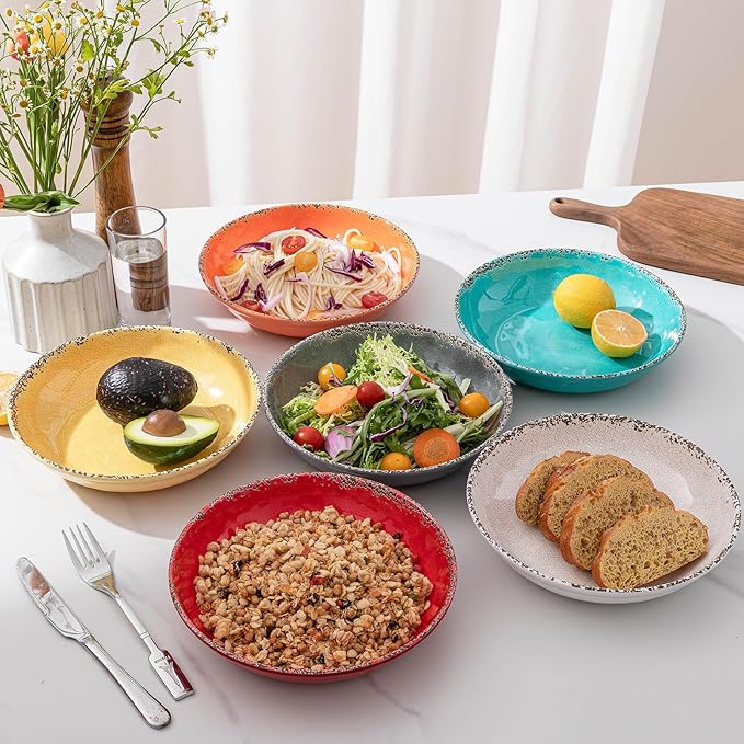 Vintage Pasta Bowl, Melamine Pasta Bowls Set of 6, 42 OZ Large Corlorful Serving Bowl for Kitchen, Dishwasher Safe Salad,Soup,Fruit, Dinner Bowls, Shallow Pasta Plates. Multi-color…