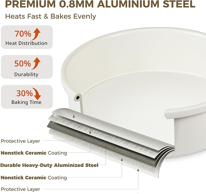 - THICKENED ALUMINIZED STEEL: Made with 0.8mm heavy-duty aluminized steel, these round cake pans heat up quickly and evenly without warping. They conduct heat faster than standard pans, reducing baking time by 3–5 minutes. Oven-safe up to 500°F, they deliver stable, reliable results every time.