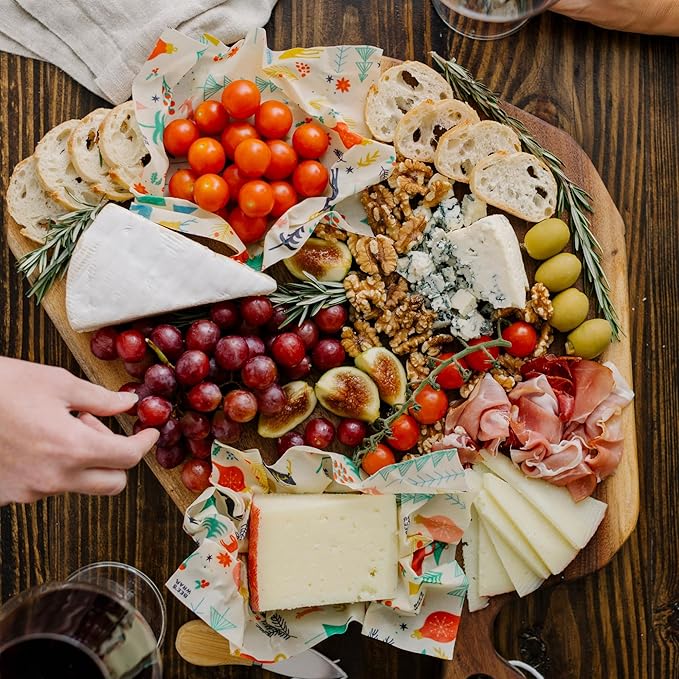 - BEESWAX WRAPS FOR FOOD in 3 sizes: small (7" x 8"), medium (10" x 11"), and large (13" x 14"), all featuring a colorful wintertime design. Made in USA reusable beeswax food wraps are sustainable products & a great alternative to single use plastic wrap, sandwich wraps, and aluminum foil.