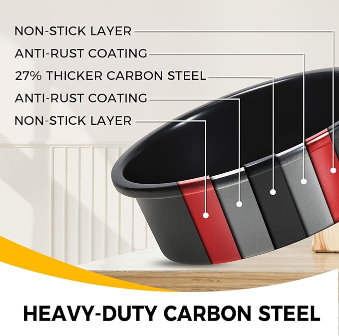 - PREMIUM THICKENED MATERIAL - With 27% thicker carbon steel, this durable 8inch cake baking pans set is constructed from heavy-gauge carbon steel for stability, even heat distribution, and durability for years to come. Warranty against peeling off with heat-resistance temperature: 450℉