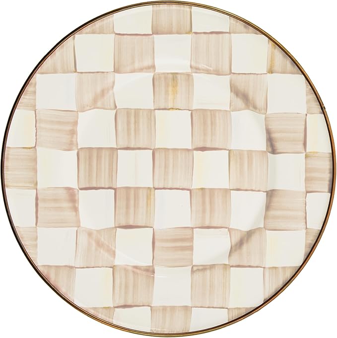 - ELEGANT SERVING ESSENTIAL: Our charming Mocha Check Enamel Salad and Dessert Plate checks all our boxes. The heavy-gauge steel underbody is glazed with hand-painted color-dragged brown-and-white checks and rimmed in bronzed stainless steel.