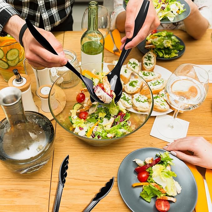 Dualshine 24 Pcs Disposable Black Plastic Serving Utensils,8 Set Including 9.72" Plastic Serving Spoons, Forks and 8.46" Tongs, for Dinner Parties, Buffets,Banquets, Events, Weddings, and Daily Use