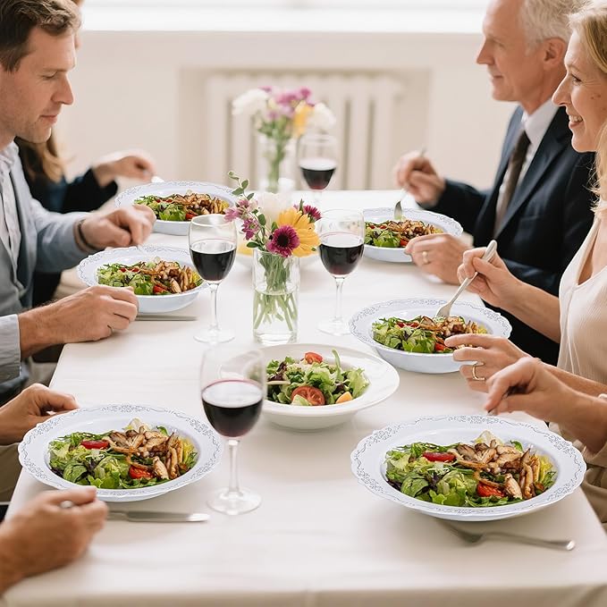 - STURDY & DURABLE - These disposable plastic bowls are crafted from heavy-duty plastic, ensuring resistance to bending and breaking. The silver-accented bowls maintain their shape and integrity even when holding hot soups, cold dishes, or heavier foods. Additionally, you can wash and store these soup bowls in a dry place for future reuse.