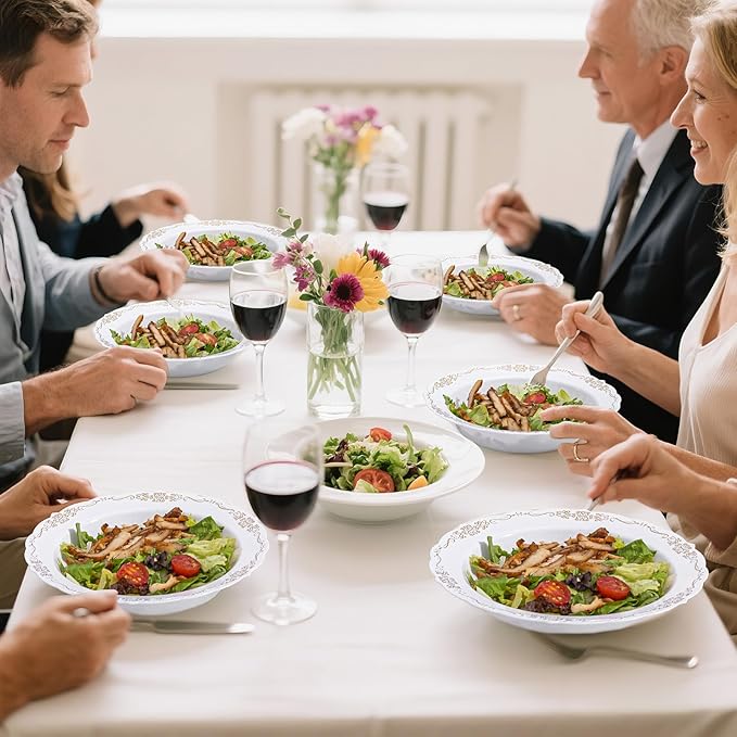 - STURDY & DURABLE - These disposable plastic bowls are crafted from heavy-duty plastic, ensuring resistance to bending and breaking. The gold-accented bowls maintain their shape and integrity even when holding hot soups, cold dishes, or heavier foods. Additionally, you can wash and store these soup bowls in a dry place for future reuse.