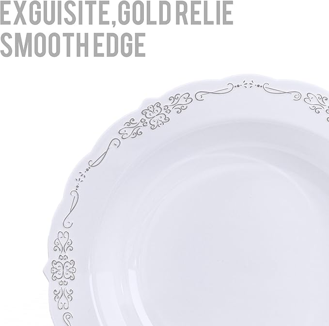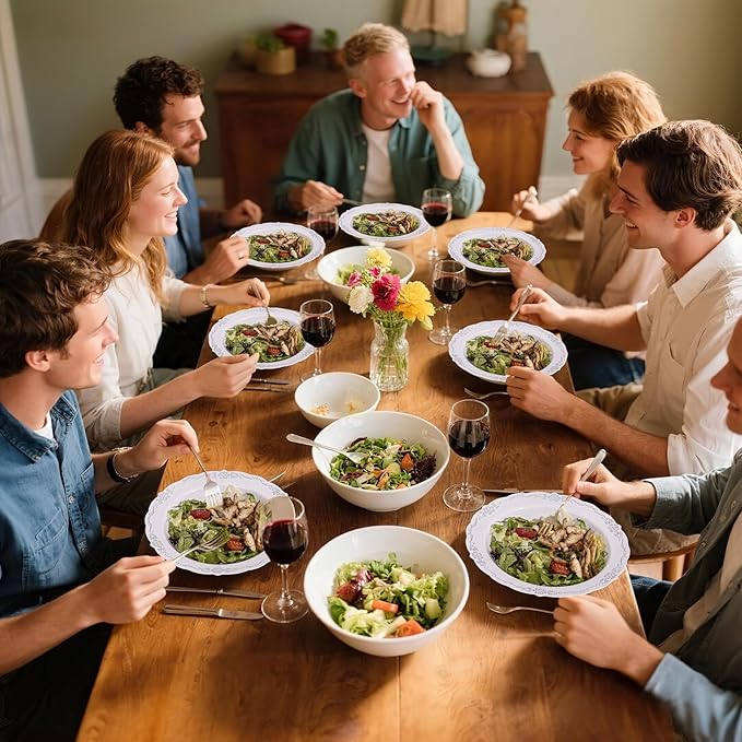 - ELEGANT APPEARANCE - Featuring a glossy finish with white bodies and silver rims, these plastic bowls complement silver silverware beautifully. Each small bowl is designed with a wide rim for easy handling while minimizing the risk of burns. Whether at an extravagant event or an intimate family dinner setting, they add sophistication and refinement to any table.