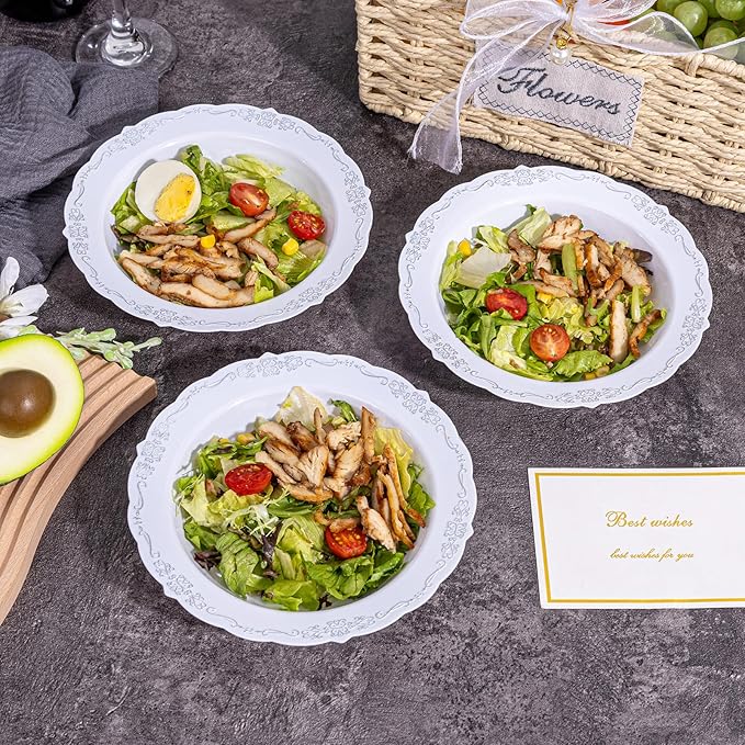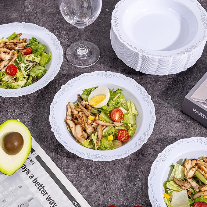 - STURDY & DURABLE - These disposable plastic bowls are crafted from heavy-duty plastic, ensuring resistance to bending and breaking. The silver-accented bowls maintain their shape and integrity even when holding hot soups, cold dishes, or heavier foods. Additionally, you can wash and store these soup bowls in a dry place for future reuse.