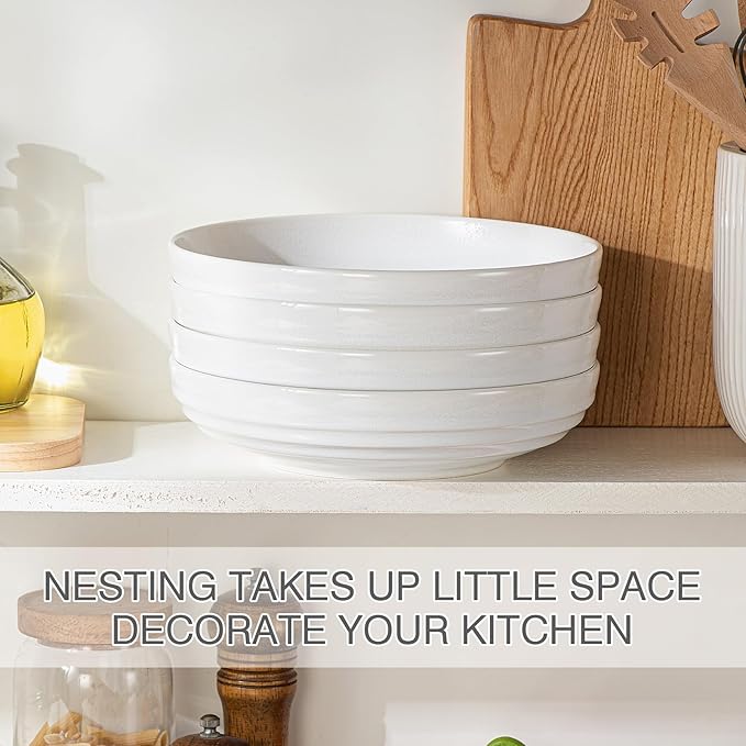 HAPPY KIT Stoneware 9'' Pasta Bowls, 42 Oz Large Salad Bowls Set of 4, Serving Bowls Perfect for Dessert, Soup, Fruit, Noodle, Granite White