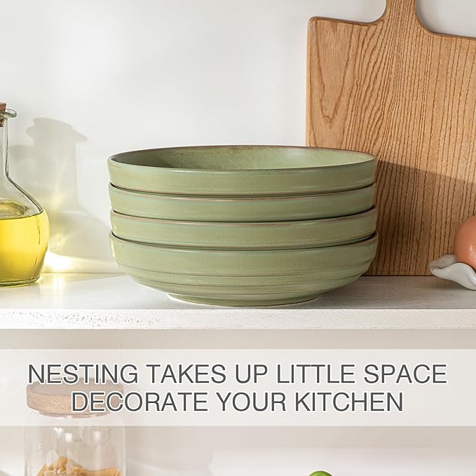 HAPPY KIT 9'' Large Pasta Bowls, 42 Oz Salad Bowl Set of 4, Stoneware Reactive Glaze Serving Bowls for Dessert, Soup, Fruit, Noodle, Scratch Resistant, Meadow Green