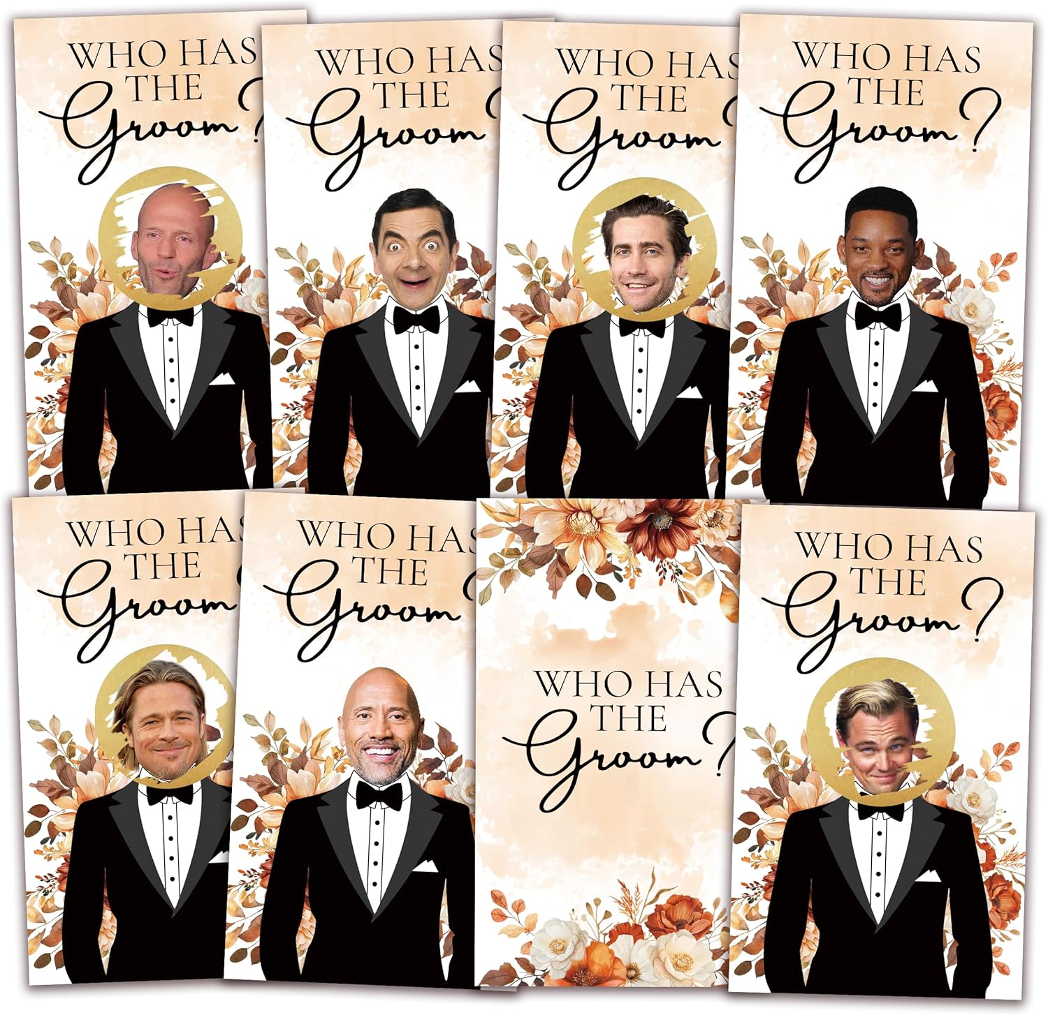 - How to play? Print the groom’s image on paper, cut it into 1" circle and stick it onto blank card. Put the round scratch-off stickers on the cards cover the groom's image and the celebrities’ image. On the day of the event, just distribute to each guest. Whoever reveals the true groom is the winner